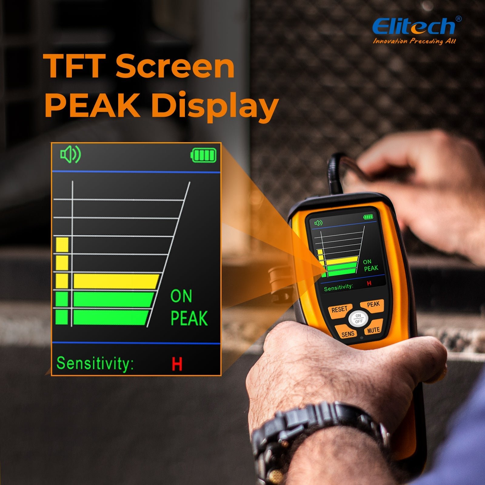 • Large TFT LCD Screen*    Very rarely in the industry, Elitech ILD-200 is equipped with a 2.8in. TFT LCD screen, to show real-time gas leakage concentration, sensitivity level, power, buzzer status, and false alarm. You can know everything about the detector in one glance.